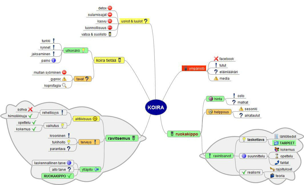 Pysähdy miettimään eri vaikuttajia ja miten ne painottavat sinun toteuttamaasi ruokintaa. Jokainen tekijä löytyy aivan jokaisen koiran ruokinnasta, vaikka ei aina omistajan tietoisella tasolla. Kuivamuonissa osa haaroista perustuu markkinoinnin myymään mielikuvaan sekä mainosväittämiin – kuten ruokakipon ravintoarvot perustuvat käsitteeseen täysravinto ja suunnittelu on toteutettu FEDIAF:n antamilla standardeilla. Terveysaspekti löytyy vaikkapa ruokaan lisätyistä yrteistä tai funktionaalisten ruokien terveyslupauksista.
