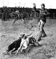 - That he that is chosen Fewterer, or that lets loose the Greyhounds, shall receive the Greyhounds matched to run together, into his Leash as soon as he comes into the field, and follow next to the hare-finder, or he who is to start the hare until he come under form; and no horseman of footman is to go before, or on any side, but directly behind, for the space of about forty yards.