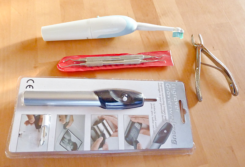 Työvälineistä tutuin lienee omistajan kynsi. Silläkin saa joskus jotain irti, olkoonkin että se tuppaa useimmiten olemaan plakkia. Kolikon syrjää käytetään useasti. Toimii, mutta työtarkkuus ei ole parhaimmasta päästä. Varsinkin ienraja on hankala. Mutta kulmahampaat ja isot takahampaat hoituvat. Työkaluja, raaputtimia ja pihtejä, saa ostaa. Hämmästyttävän moni luulee, että lääkärin välineistö on kuin reseptilääkkeet – tarvitaan joku lupa. Ei tarvita. Kannattaa kysyä josko oma lääkäri suostuisi myymään. Tai googlettaa firma, joka niitä myy. Apteekeistakin välillä saa, mutta apteekin hinnoilla. Niillä saa huomattavasti enemmän aikaiseksi kuin kynnellä tai kolikolla. ammattivehkeitä kun ovat.