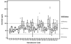 25(OH)D:n mediaani (eli arvojen keskiväli) vaihteli melkoisesti eri teollisten ruokamerkkien välillä, 118,5 – 250,3. Toki per ruokamerkki ei ollut kovinkaan montaa tutkittavaa, mutta silti tuo tarkoittaa sitä, että suurimmalla osalla täysrehuja syöneistä oli riittävät D-vitamiinitasot käytettyjen rajojen perusteella.