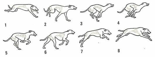 Koira on siis yhden segmentin aikana kaksi kertaa kokonaan ilmassa, ja koskettaessaan maata vain yksi jalka kerrallaan, joka kantaa koko painon.
