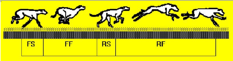 FS= front support (etujalat kosketuksessa), FF = front flight (etujalat lennossa), RS = rear support (takajalat kosketuksessa), RF = rear flight (takajalat lennossa)