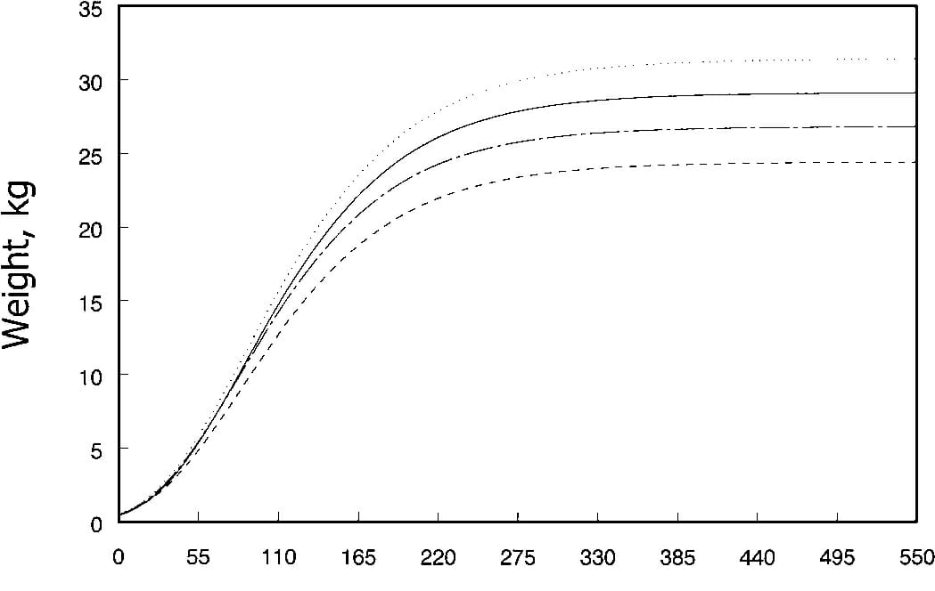 Useimmilla koirilla kiihkeimmän kasvun kääntöpiste, eli ollaan saavutettu 50 % aikuispainosta, on noin neljän kuukauden iässä (Lewis et al., 1992; Biourge ja Kirk, 1995). Ylipäätään suurten koirien kasvu on loppuu 300 – 480 päivän iässä eli 10 – 16 kk paikkeilla (Lewis et al., 1992; Case et al., 1995). Jos kaavassa käytettäisiin aikuispainon 50 % kohtaa, niin kaava ennustaisi kasvun päättymisen kahdeksan kuukauden kohdalle, joten olisi syytä käyttää kääntöpisteenä 36,8 % aikuispainosta, jolloin käyrästö sopisi tarkemmin kaikille koirille ja yksilöille.