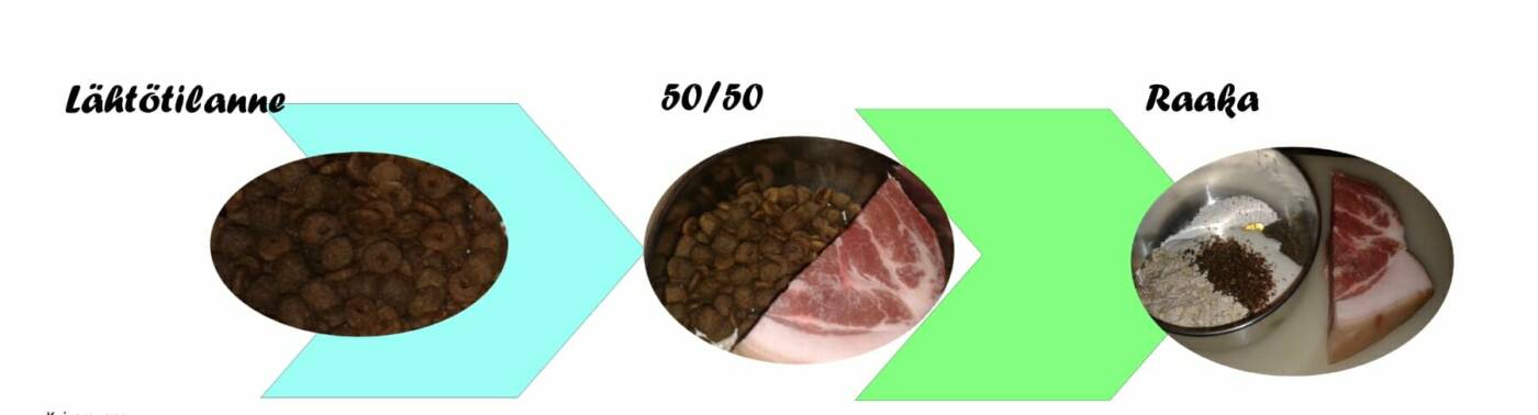 Jos perusteet aloittamiseen ovat koiran oireilussa, muutoksia oireiluissa kannattaa seurata ja kirjata ylös. Osta ihan tavallista jauhelihaa tai palalihaa, mielellään yhden eläimen, ja korvaa osa päivittäisestä nappularuoka-annoksesta sillä. Voit kokeilla yksi kerrallaan useampia elukoita, syötä kuitenkin alkuun vain yhtä elukkaa kerrallaan, jolloin näet sopivuuden heti. Seuraavaksi voikin siirtyä täysin raakaan, jos siltä tuntuu.