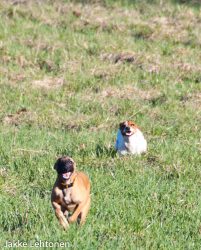 Tarha ei ole päättömän suuri. Meillä käyneet tietävät hiekkatarhamme koon. Ehkä luokkaa muutamakymmenen kertaa parikymmentä. Parahultainen olla, telmiä ja liikkua, mutta tilaa ei ole päättömään koheltamiseen – kolmen hehtaarin tarhat ovat pentujen liikkumisen suhteen negatiivisella puolella hyöty/laatu-ajattelussa.