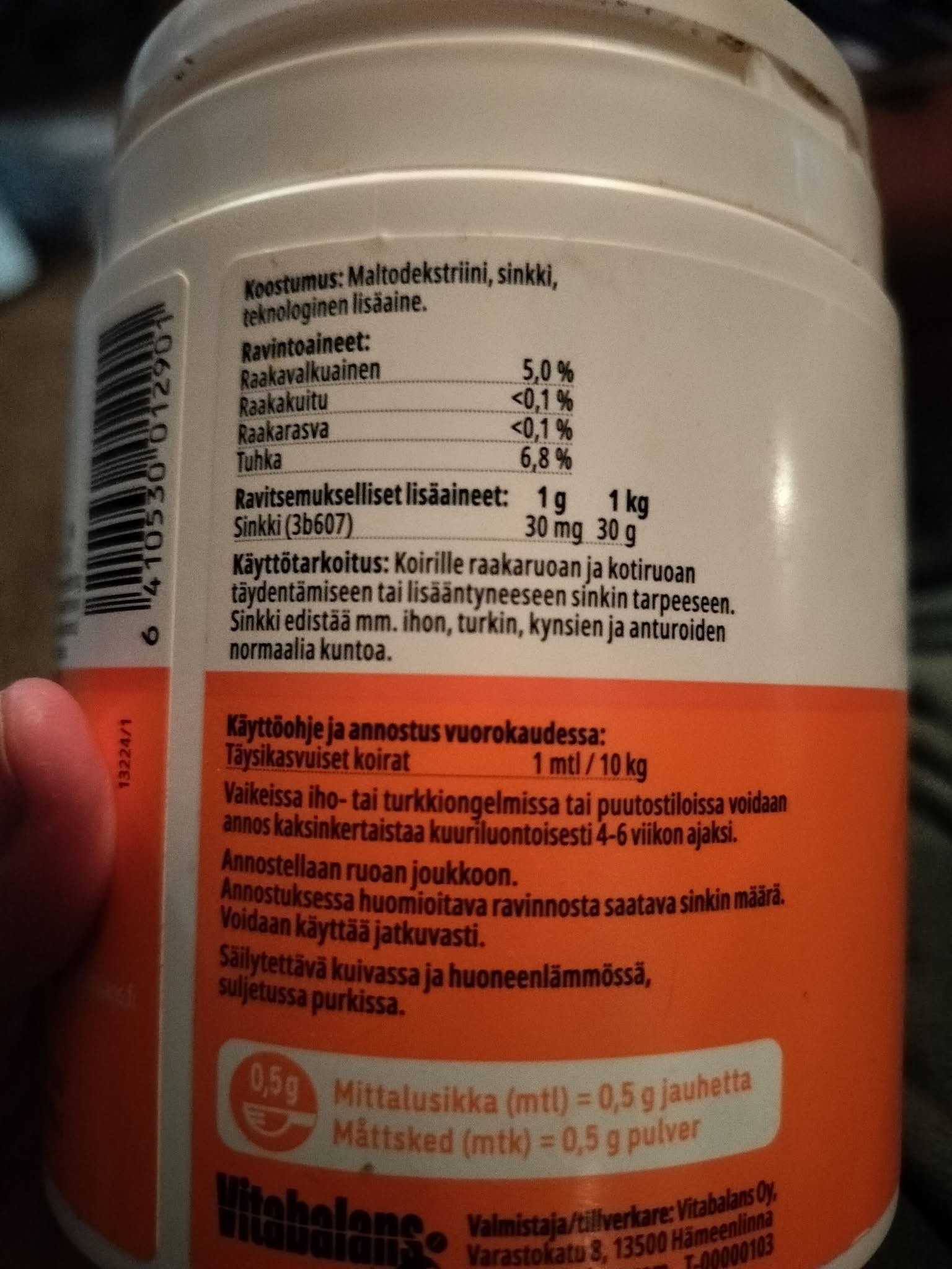 Sinkkinä oli Vidan vahva sinkki, jota löytyy lähes jokaisesta ruokakaupasta, mutta ei Lidlistä. Annokseen meni täysi purkki, joka antaa hieman vähemmän kuin tavoiteltu 2 mg/kg, mutta siinä joustin helppouden nimissä.