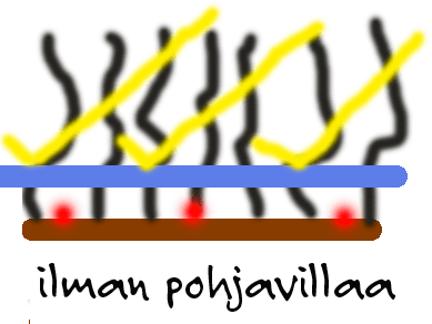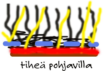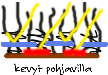 Kevyemmällä pohjavillalla varustettu sen sijaan alkaa etsimään varjoa aikaisemmin, koska pohjavilla estää ilman liikkumista, eikä jäähtyminen ole enää tehokasta. Koska heikompi pohjavilla kuitenkin myös eristää hiukan, niin osa lämmöstä ei pääse kiusaamaan koiraa – ennen kuin turkki on ”ladattu” lämpöä täyteen kuin kiukaan kivet. Silloin eristys alkaa olla tehokasta, koska mitä pienempi lämpätilaero on, niin sitä heikommin lämpö siirtyy koiran verenkierrosta ulkoilmaan.